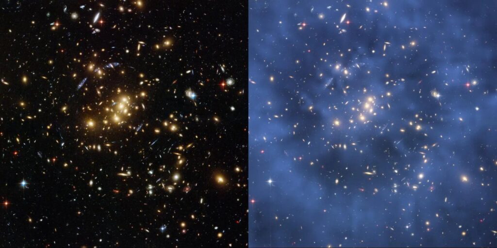 Çfarë është Universi -a5 side-by-side-images-of-galaxy-cluster. – Tregohen dy pamje nga Hubble të grupit masiv të galaktikave Cl 0024+17 (ZwCl 0024+1652). Në të majtë është pamja në dritë të dukshme me harqe blu me pamje të çuditshme që shfaqen midis galaktikave të verdhë. Këto janë imazhet e zmadhuara dhe të shtrembëruara të galaktikave të vendosura shumë prapa grupit. Drita e tyre përkulet dhe amplifikohet nga graviteti i jashtëzakonshëm i grupit në një proces të quajtur lente gravitacionale. Në të djathtë, një hije blu është shtuar për të treguar vendndodhjen e materialit të padukshëm të quajtur materia e errët që kërkohet matematikisht për të llogaritur natyrën dhe vendosjen e galaktikave me lente gravitacionale që shihen. – NASA, ESA, M.J. Jee dhe H. Ford (Universiteti Johns Hopkins)