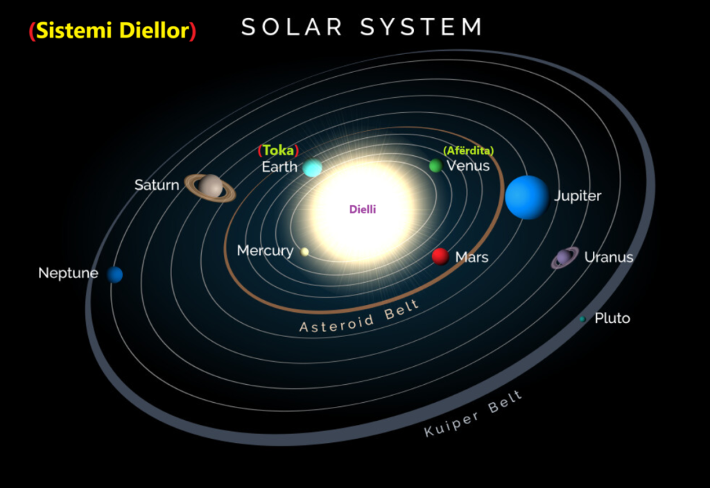 Në renditje, Planetët nga Dielli, janë: 1. Mërkuri, 2. Venera (Afërdita), 3. Toka, 4. Marsi, 5. Jupiteri, 6. Saturni, 7. Urani dhe 8. Neptuni, të ndjekur nga planetët xhuxh.