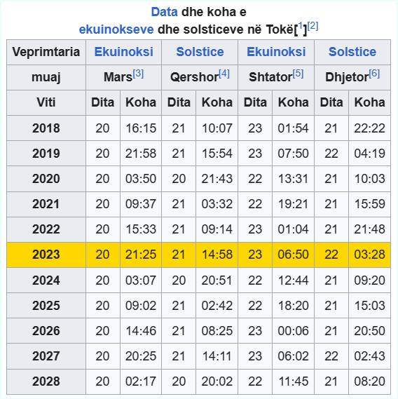 Tabela është marrë me scrinshot nga en.wikipedi.org/wiki/Solstice