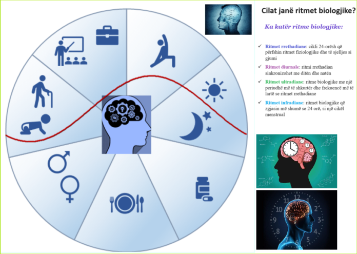 - Ritmet rrethadiane: cikli 24-orësh që përfshin ritmet fiziologjike dhe të sjelljes si gjumi