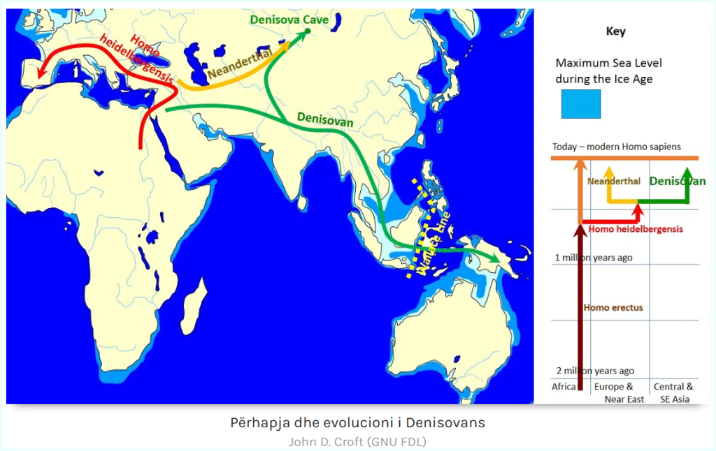 Midis 300,000 dhe 400,000 vjet më parë, një grup i Homo heidelbergensis u largua nga Afrika. Ata u zgjeruan në Euroazi dhe pastaj u ndanë: Ata që u zhvendosën në perëndim në Evropë evoluan në Neandertalë. Ata që u zhvendosën në lindje në Azi u bënë Denisovans.