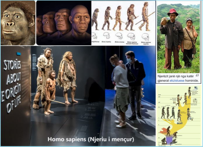 Evolucioni njerëzor, procesi me të cilin qeniet njerëzore u zhvilluan në Tokë nga primatët tani të zhdukur. Shikuar nga ana zoologjike, ne njerëzit jemi Homo sapiens, një specie që ecën drejt kulturës që jeton në tokë dhe ka shumë të ngjarë të ketë evoluar për herë të parë në Afrikë rreth 315.000 vjet më parë. Ne jemi tani të vetmit anëtarë të gjallë të asaj që shumë zoologë i referohen si fisi njerëzor, Hominini, por ka prova të bollshme fosile që tregojnë se ne u paraprimë për miliona vjet nga homininët e tjerë, si Ardipithecus, Australopithecus, dhe lloje të tjera të Homo, dhe se edhe speciet tona jetuan për një kohë në mënyrë bashkëkohore me të paktën një anëtar tjetër të gjinisë sonë, Homo neanderthalensis (Neandertalët). Përveç kësaj, ne dhe paraardhësit tanë gjithmonë e kemi ndarë Tokën me primatë të tjerë apelikë, që nga gorilla e ditëve moderne e deri te Dryopithecus i zhdukur prej kohësh. Që ne dhe homininët e zhdukur jemi disi të lidhur dhe se ne dhe majmunët, si të gjallë ashtu edhe të zhdukur, jemi gjithashtu disi të lidhur pranohet nga antropologët dhe biologët kudo. Megjithatë, natyra e saktë e marrëdhënieve tona evolucionare ka qenë objekt debatesh dhe hetimesh që kur natyralisti i madh britanik Charles Darwin botoi librat e tij monumentalë Mbi origjinën e specieve (1859) dhe Zbritja e Njeriut (1871). Darvini nuk pohoi kurrë, siç këmbëngulnin disa nga bashkëkohësit e tij viktorianë, se «njeriu ishte zbritur nga majmunët» dhe shkencëtarët modernë do ta shihnin një pohim të tillë si një thjeshtim të padobishëm, ashtu siç do të hidhnin poshtë çdo ide popullore se një specie e caktuar e zhdukur është “lidhja e munguar” midis njerëzve dhe majmunëve. Megjithatë, teorikisht ekziston një paraardhës i përbashkët që ekzistonte miliona vjet më parë. Kjo specie stërgjyshore nuk përbën një “lidhje të munguar” përgjatë një linje, por përkundrazi një nyje për divergjencë në linja të veçanta. Ky primat i lashtë nuk është identifikuar dhe mund të mos njihet kurrë me siguri, sepse marrëdhëniet fosile janë të paqarta edhe brenda linjës njerëzore, e cila është më e fundit. Në fakt, “pema familjare” njerëzore mund të përshkruhet më mirë si një “shkurre familjare”, brenda së cilës është e pamundur të lidhësh një seri të plotë kronologjike speciesh, duke çuar në Homo sapiens, për të cilën ekspertët mund të bien dakord. -(6)