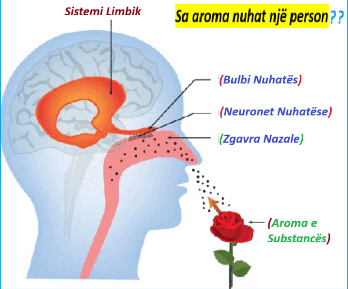 – **Receptorët olfaktivë**: Njerëzit kanë rreth *400 lloje receptorësh aromash*. Këta receptorë zbulojnë molekulat e aromave dhe dërgojnë sinjale në tru.