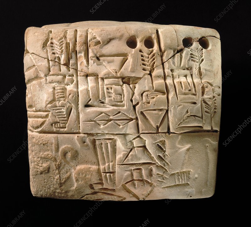 Pllakë sumeriane kuneiforme, mijëvjeçari i 4-të deri në të 3-tin p.e.s. Rrëfim administrativ nga Mesopotamia sumeriane, që mendohet se ka të bëjë me drithërat e shpërndara nga një tempull i madh. Daton nga periudha Jemdet Nasr, rreth viteve 3100-2900 p.e.s., dhe mendohet të jetë nga Uruku (Warka moderne). Piktogramet në këtë pllakë argjile quhen proto-kuneiforme dhe janë vizatuar me një mjet të mprehtë. Gjurmët rrethore përfaqësojnë simbole numerike. Kur piqen, të dhënat e shkruara në argjilë bëhen të përhershme. Shkrimi i hershëm është përdorur kryesisht për të regjistruar informacion ekonomik. Ky objekt është pjesë e koleksioneve të Muzeut Metropolitan të Artit, New York City, SHBA.