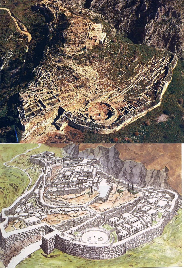 Kështjella e Mikenës e Epokës së Bronzit e ndërtuar në një kodër 274 metra mbi nivelin e detit, Greqi, 1600-1100 p.e.s. (sipër) dhe rindërtimi (poshtë).