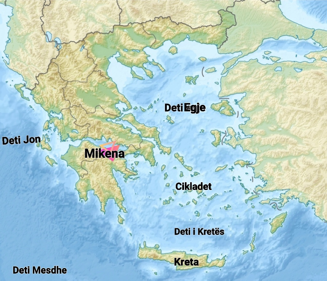 [: Mikena është një vend arkeologjik pranë Mikines në Argolis, Peloponezi verilindor, Greqi. Ndodhet rreth 120 kilometra në jugperëndim të Athinës; 11 kilometra në veri të Argosit; dhe 48 kilometra në jug të Korintit. Vendi është 19 kilometra në brendësi të Gjirit Saronik dhe i ndërtuar mbi një kodër që ngrihet 274 metra mbi nivelin e detit. [- Mycenae Wikipedia]1.