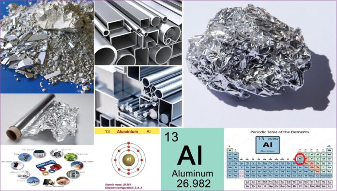 Alumini (Al), element kimik, numri atomik 13, në sistemin periodik të elementeve gjendet në periodën 3 dhe grupin 13. Alumini është një metal pa erë, i lehtë, i bardhë argjendi dhe është metali i tretë më i bollshëm në koren e Tokës që përfshin 8% të sipërfaqes së Tokës. Zakonisht gjendet në toka, minerale dhe shkëmbinj si një përbërje me oksigjen, silikon ose fluor.