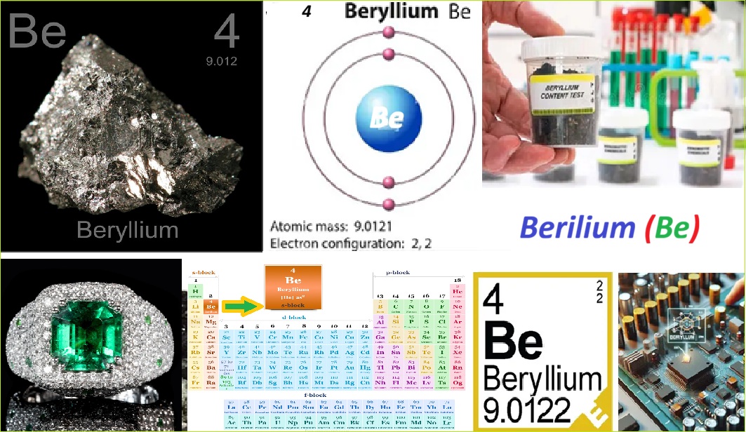 Beriliumi, simboli Be, është një element kimik, numri atomik 4, pesha relative atomike 9.0122 në tabelën periodike gjendet në periodën 2 dhe Grupin 2 (IIa), një metal i tokës alkaline gri, i fortë. Beriliumi (Be), i përdorur në metalurgji si agjent ngurtësues, përdoret në ingranazhe dhe dhëmbëzor, veçanërisht në industrinë e aviacionit. dhe në shumë aplikime të hapësirës së jashtme dhe bërthamore.
