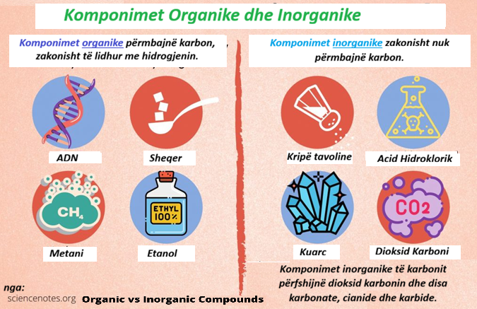 Komponimet organike përmbajnë karbon, zakonisht të lidhur me hidrogjenin. Komponimet inorganike ose nuk përmbajnë karbon ose përndryshe janë të lidhura me oksigjenin, azotin ose një metal.