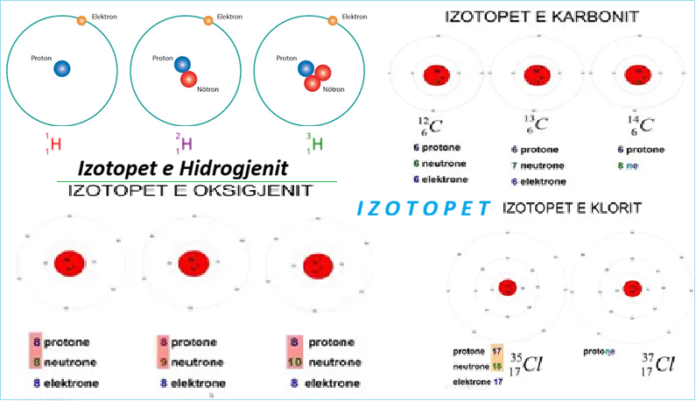 [: Izotopet janë lloje të veçanta bërthamore (ose nuklide) të të njëjtit element kimik. Ata kanë të njëjtin numër atomik (numri i protoneve në bërthamat e tyre) dhe pozicion në tabelën periodike (dhe për këtë arsye i përkasin të njëjtit element kimik), por numra të ndryshëm nukleonesh (numra mase) për shkak të numrit të ndryshëm të neutroneve në bërthamat e tyre. Ndërsa të gjitha izotopet e një elementi të caktuar kanë pothuajse të njëjtat veti kimike, ato kanë masa atomike dhe veti fizike të ndryshme.]1