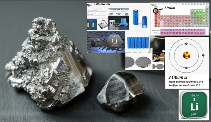 Litiumi, element kimik, simboli Li, grupi 1 (Ia) në tabelën periodike, grupi i metaleve alkali, numri atomik 3, ka një peshë atomike relative prej 6.940 dhe një numër mase prej 7. Litiumi ka tre protone dhe katër neutrone në bërthamën e tij dhe tre elektrone në dy guaskë. Ndodhet në grupin e parë, periudhën e dytë dhe bllokun s të tabelës periodike. Litiumi (Li) është një metal alkali shumë reaktiv, i lehtë thelbësor për bateritë, trajtimin e shëndetit mendor dhe aplikime të ndryshme industriale. Shih: 1. Përdorimet e Litiumit. 2. Litiumi në medicinë.