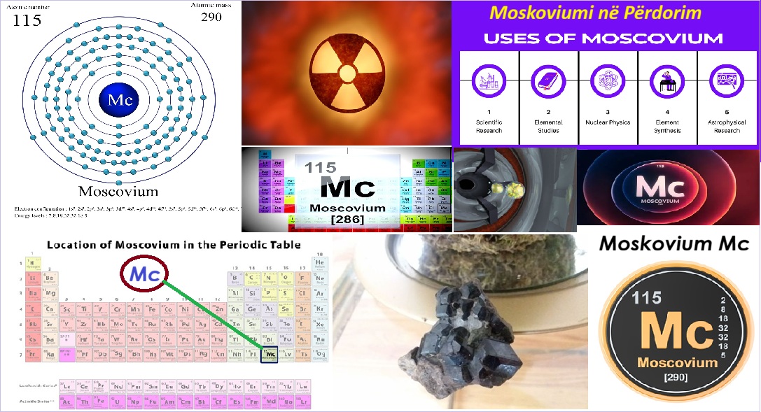 [: Moscovium (Mc), element transuranium i prodhuar artificialisht me numër atomik 115. Në vitin 2010 shkencëtarët në Institutin e Përbashkët për Kërkime Bërthamore në Dubna, Rusi, dhe në Laboratorin Kombëtar Lawrence Berkeley në Berkeley, Kaliforni, SHBA, njoftuan prodhimin e katër atomeve të moscovium kur kalciumi-48 u shkri me americium-243. Dy izotope të moskoviumit u prodhuan me peshë atomike prej 287 dhe 288; Këto izotope u prishën përkatësisht në 46.6 dhe 19-280 milisekonda. Vetitë e tij kimike mund të jenë të ngjashme me ato të bismutit. Në janar 2016 zbulimi i moscoviumit u njoh nga Unioni Ndërkombëtar i Kimisë së Pastër dhe të Aplikuar (IUPAC) dhe Unioni Ndërkombëtar i Fizikës së Pastër dhe të Aplikuar (IUPAP). Zbuluesit e quajtën atë moscovium sipas rajonit të Moskës ku ndodhet Instituti i Përbashkët për Kërkime Bërthamore. Emri moscovium u miratua nga IUPAC në nëntor 2016.]3