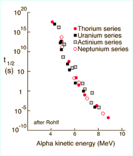 Energjia e grimcave alfa të emetuara ishte një mister për studiuesit e hershëm sepse ishte e qartë se ata nuk kishin energji të mjaftueshme, sipas fizikës klasike, për t’i shpëtuar bërthamës. Pasi një madhësi e përafërt e bërthamës u mor nga shpërndarja e Rutherford, mund të llogaritej lartësia e barrierës Coulomb në rrezen e bërthamës. Ishte e qartë se kjo energji ishte disa herë më e lartë se energjitë e grimcave alfa të vëzhguara. Ekzistonte gjithashtu një gamë e jashtëzakonshme gjysmëjetash për grimcën alfa që nuk mund të shpjegohej me asgjë në fizikën klasike.