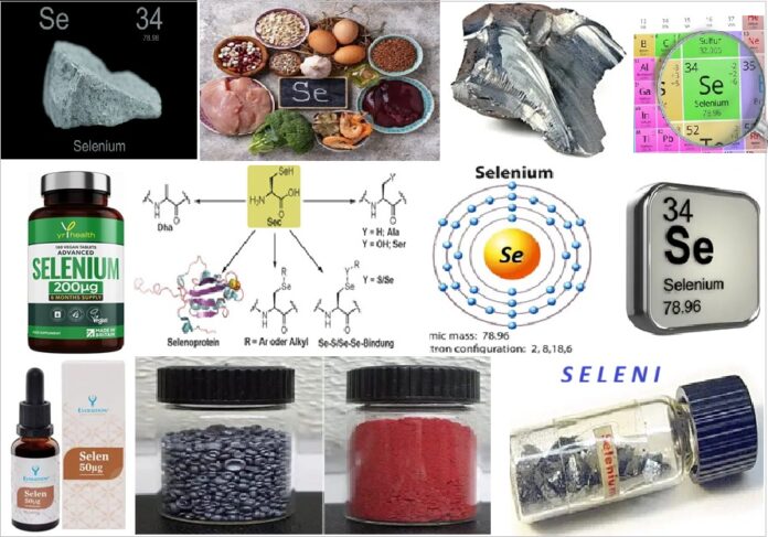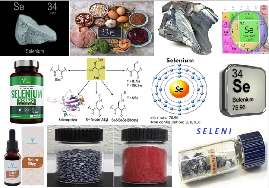 [: selen (Se), një element kimik në grupin e oksigjenit (Grupi 16 [VIa] i tabelës periodike), i lidhur ngushtë në vetitë kimike dhe fizike me elementët squfur dhe telur. Seleni është i rrallë, duke përbërë afërsisht 90 pjesë për miliard të kores së Tokës. Herë pas here gjendet i pakombinuar, duke shoqëruar squfurin vendas, por më shpesh gjendet në kombinim me metale të rënda (bakër, merkur, plumb ose argjend) në disa minerale. Burimi kryesor komercial i selenit është si një nënprodukt i rafinimit të bakrit; Përdorimet e tij kryesore janë në prodhimin e pajisjeve elektronike, në pigmente dhe në prodhimin e qelqit. Seleni është një metaloid (një element i ndërmjetëm në veti midis metaleve dhe jometaleve). Forma gri, metalike e elementit është më e qëndrueshme në kushte të zakonshme; Kjo formë ka vetinë e pazakontë të rritjes së madhe të përçueshmërisë elektrike kur ekspozohet ndaj dritës. Komponimet e selenit janë toksike për kafshët; Bimët e rritura në toka selenifere mund të përqendrojnë elementin dhe të bëhen helmuese.]2