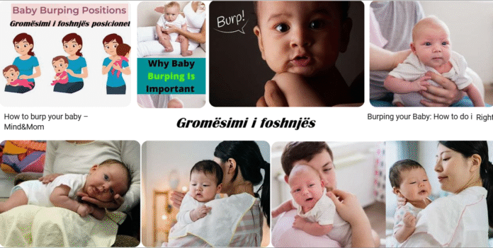 - Ndihmojeni foshnjën të ulet, duke mbështetur trupin dhe kokën e foshnjës. Disa prindër preferojnë ta zhvendosin foshnjën në një pozicion të ulur dhe t’i mbështetin mbi njërën dorë, në mënyrë që foshnja të mbështetet pak përpara. Me dorën tjetër, fërkoni ose dridheni shpinën e foshnjës derisa foshnja të gromësoi.