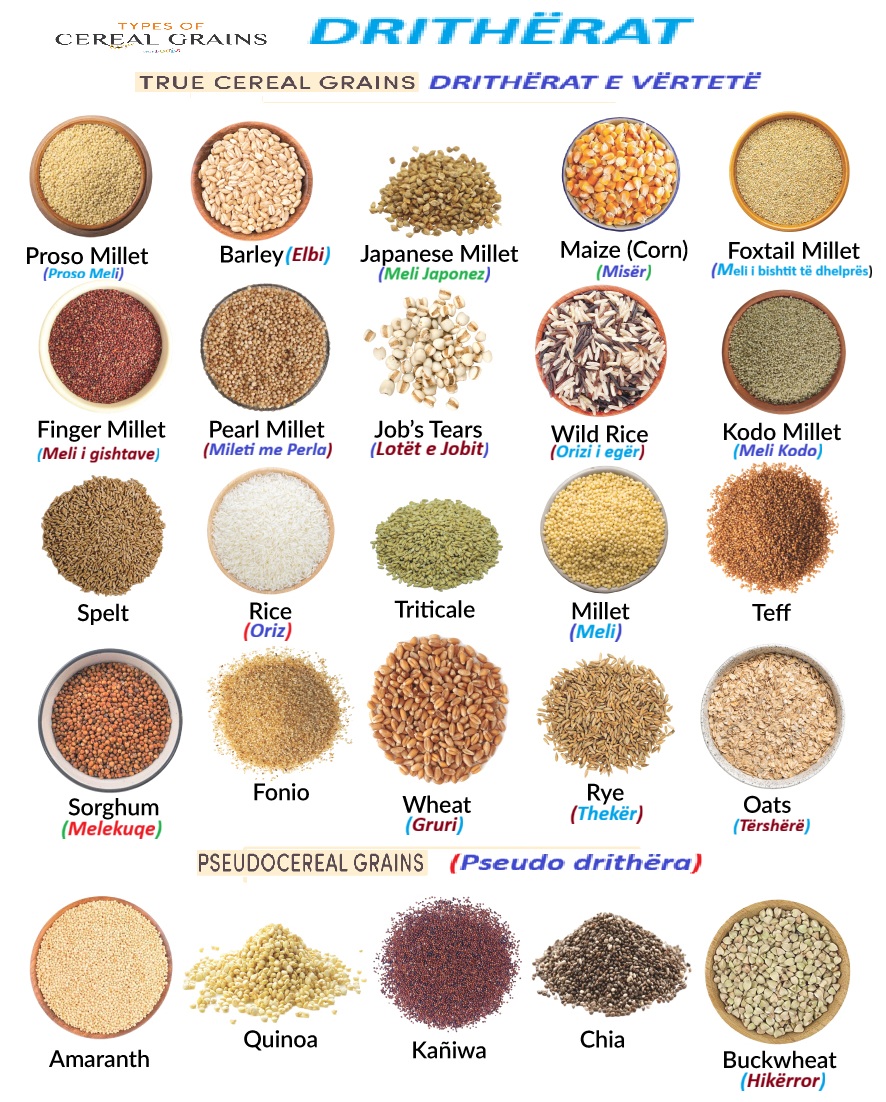 Komercialisht, drithërat mund të klasifikohen në drithëra dhe bishtajore. Drithërat vijnë nga bimët e familjes Grass ose Poaceae dhe konsiderohen si ‘drithëra’ në kuptimin e përgjithshëm. Bishtajoret i përkasin familjes Fabaceae. Lista e mëposhtme përfshin vetëm drithërat më të zakonshme të rritura dhe konsumuara në mbarë botën.[3]