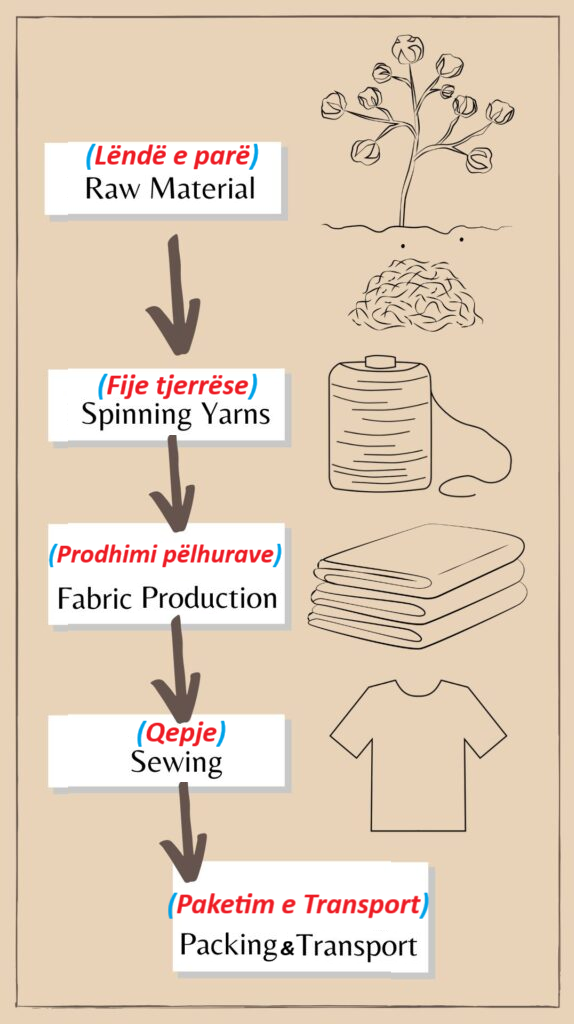 Udhëtimi i një produkti tekstili është fibra – fije – pëlhurë – veshje